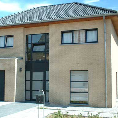 Een vrijstaande nieuwbouwwoning gerealiseerd in de regio Weert. Op de foto is de afgewerkte gevel zichtbaar met nette metselwerkdetails en een moderne dakopbouw. Het project is van fundering tot oplevering door ons team uitgevoerd.